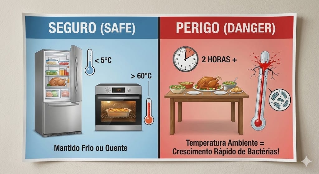 Segundo a ANVISA e especialistas em segurança alimentar, existe uma “Zona de Perigo” (entre 5°C e 60°C) onde os micro-organismos fazem a festa. Neste calor, a regra é rígida: