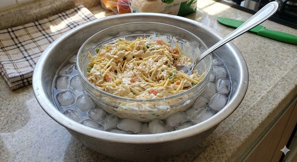 - O Truque do “Banho de Gelo”: Não coloque a tigela do Salpicão ou da Maionese direto na toalha da mesa. Pegue uma tigela maior, encha de gelo e encaixe a travessa da comida dentro. Isso mantém a temperatura baixa por muito mais tempo.