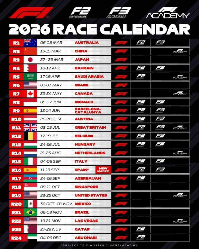 - Calendário Oficial FIA Formula 1 2026 (Imagem Fornecida).