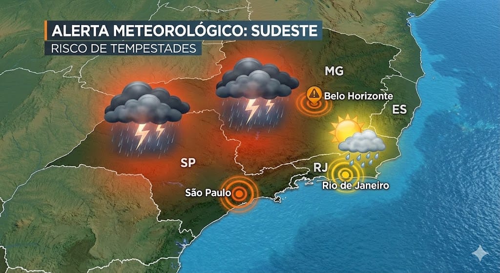 ⛈️ Minas Gerais (Sul e BH): Alerta para temporais. O encontro da massa quente com a umidade da Amazônia deve provocar chuvas pesadas no sul de Minas e na região metropolitana de BH durante a noite.