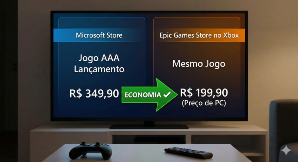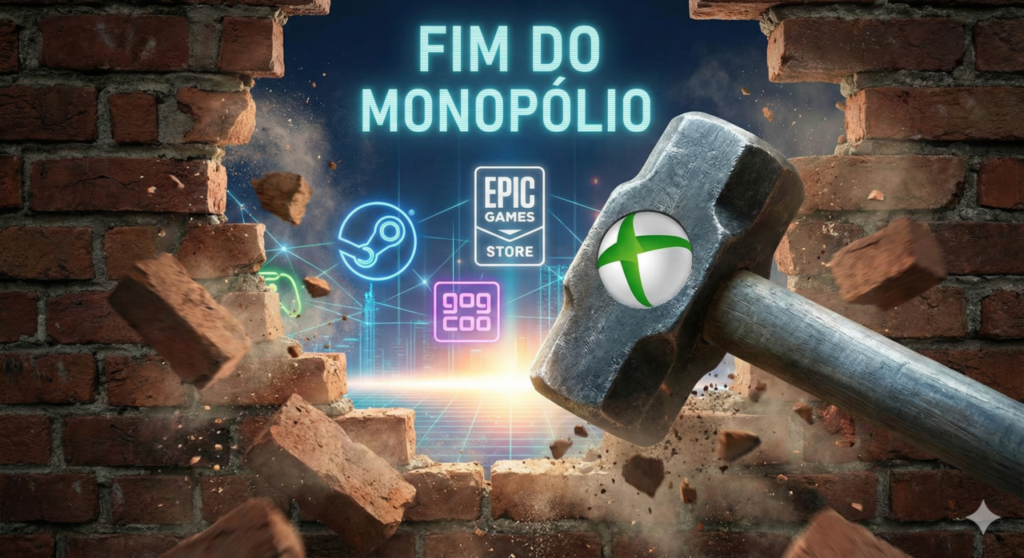 Vamos ser honestos: a maior dor de cabeça de qualquer jogador de console no Brasil não é o “lag”, é o preço dos jogos. Por décadas, aceitamos a regra de que, se você comprou o aparelho, só pode comprar jogos na loja oficial da marca, pagando o preço que eles decidirem. Pois bem, essa era de “monopólio digital” acabou de sofrer seu golpe fatal nesta manhã. Imediatamente após a publicação de uma entrevista bombástica, o mundo dos games parou: a Epic Games Store está oficialmente confirmada dentro do próximo Xbox.