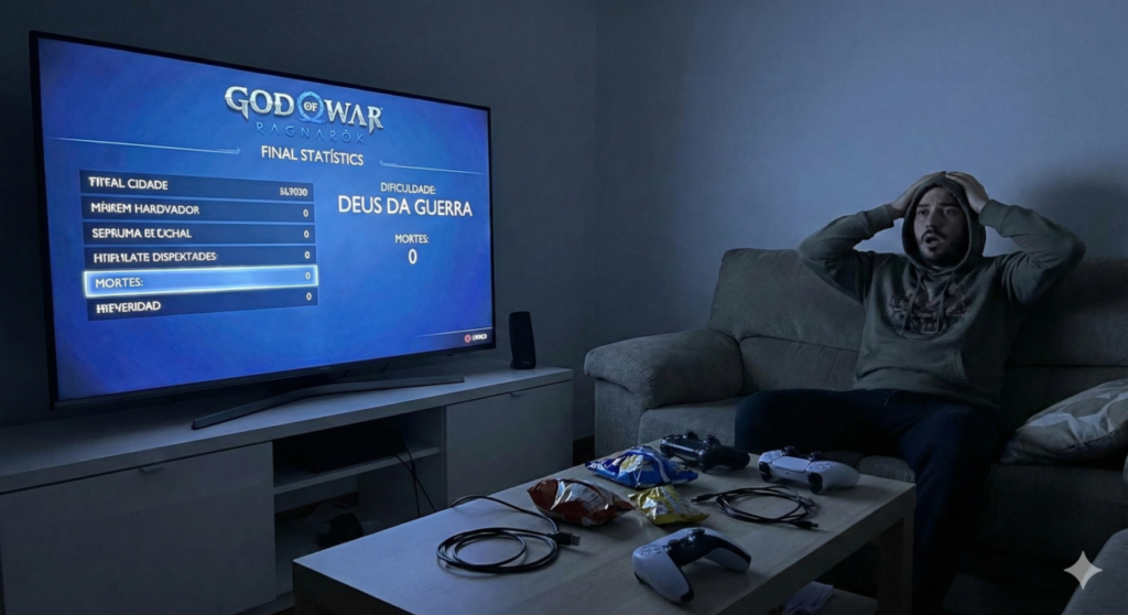 Se você achava que a história era apenas um prequel isolado sobre Kratos e Deimos, prepare-se. Enquanto os créditos sobem para os jogadores comuns, quem superou o modo “Deus da Guerra” sem ver a tela de Game Over recebeu uma mensagem direta do futuro.