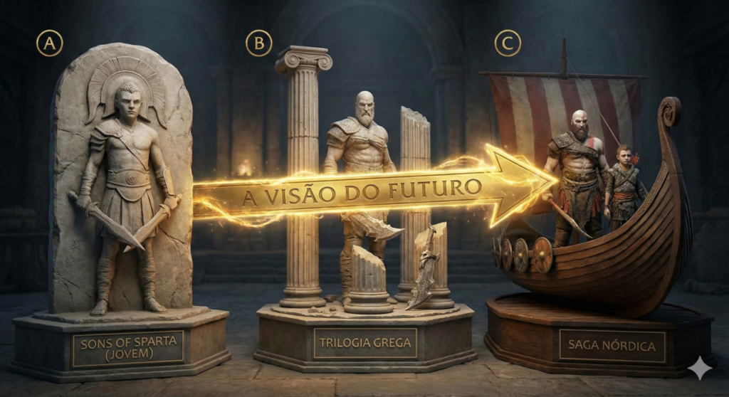 Dessa forma, a teoria dos fãs foi confirmada: Sons of Sparta não é apenas passado; é uma memória sendo revisitada pelo Kratos do futuro (possivelmente após a DLC Valhalla). Com isso, a Sony amarra pontas soltas de 20 anos de franquia em apenas 20 segundos de vídeo.