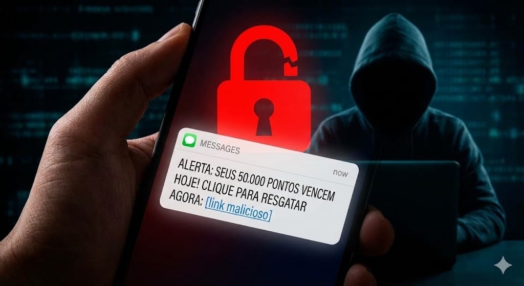 Este é o golpe de Smishing (Phishing por SMS) mais perigoso do final de 2025. Os criminosos sabem que, estatisticamente, muitos pontos realmente vencem no fim do ano, e usam essa verdade para te contar uma mentira cara.