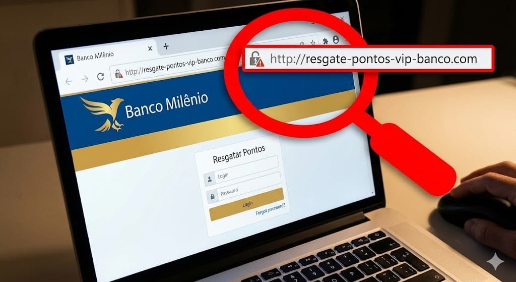 O Link Encurtado: Bancos não usam bit.ly, resgate-agora.site ou pontos-2025.com. Eles usam seus domínios oficiais (livelo.com.br, itau.com.br).