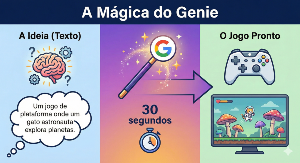 Sabe aquela ideia maluca de videogame que você teve no banho, mas desistiu porque não faz a menor ideia de como escrever uma única linha de código? Neste cenário de frustração criativa constante, o Google decidiu entregar a varinha mágica nas suas mãos. Enquanto o mundo ainda se impressionava com IAs que criam vídeos e músicas, a gigante da tecnologia liberou hoje cedo, para o público geral, o Google Genie 2.0. A ferramenta promete fazer em segundos o que estúdios demorariam meses.