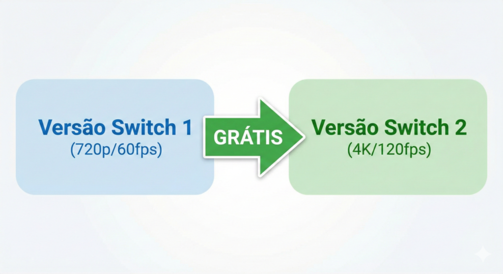Nós sabemos que a Nintendo é famosa por cobrar preço cheio em “remasters” e relançamentos (vide Mario Kart 8 Deluxe). Contudo, dessa vez a regra mudou. Na verdade, estamos vendo a estreia do sistema de “Smart Delivery” no ecossistema da empresa: você compra o jogo uma vez e joga a melhor versão possível, sem pagar nenhum centavo a mais.