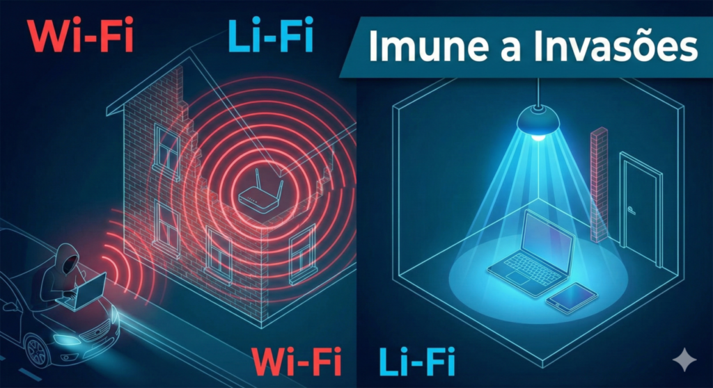 Contudo, o Li-Fi resolve tudo isso com uma barreira natural: a luz não atravessa a parede. Consequentemente, a sua rede fica 100% confinada ao cômodo onde a lâmpada está acesa. Dessa forma, é fisicamente impossível que alguém fora daquela sala roube a sua conexão ou invada a sua rede doméstica.