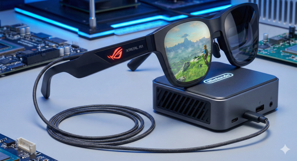 O que fez esse gadget viralizar de verdade, todavia, foi a descoberta de sua compatibilidade nativa com o ecossistema da Nintendo. Detalhes técnicos revelados hoje mostram que o ROG XREAL R1 possui um “dock” portátil específico, desenhado para se comunicar perfeitamente com o vindouro Nintendo Switch 2.