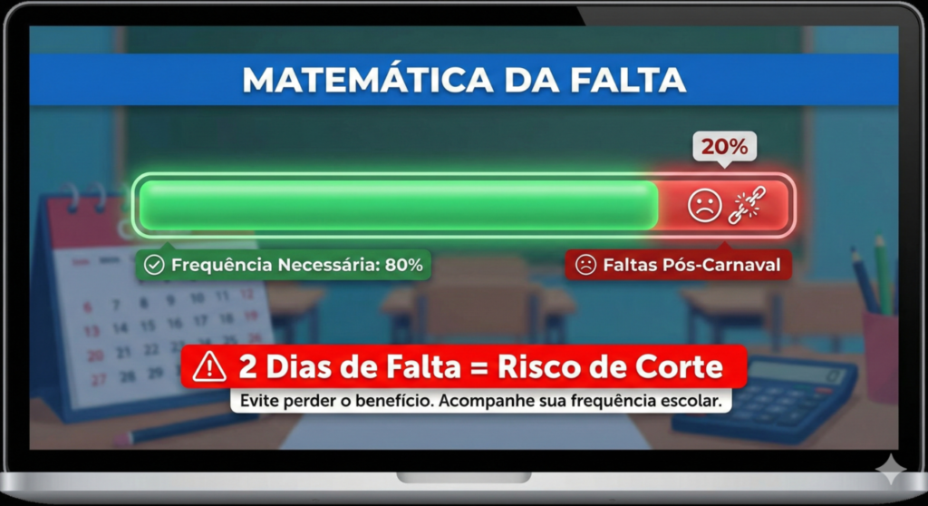 Se você recebe o benefício, o alerta é vermelho. Segundo as regras do programa, a frequência escolar deve ser de, no mínimo, 80% todos os meses. Diante disso, faltar nesta quinta e sexta-feira pós-Carnaval é uma armadilha estatística perigosa.