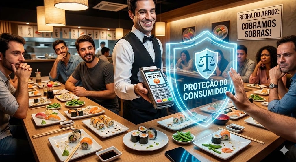 Outra cena comum nesta semana: a mesa do rodízio pede comida demais, sobra aquele monte de sashimi e o restaurante quer cobrar a “Taxa de Desperdício”.