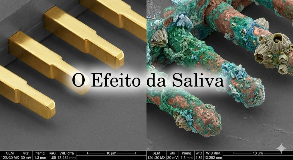 Os pinos dos cartuchos são feitos de cobre ou latão (às vezes banhados a ouro). Portanto, quando esses metais encontram a umidade da sua boca, ocorre a oxidação. Com o tempo, forma-se o “zinabre” (aquela crosta verde), que isola a eletricidade.