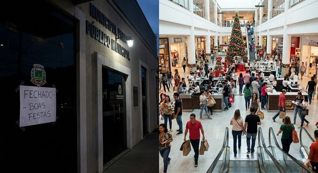 Enquanto o serviço público para, o varejo acelera. Hoje é o dia mais movimentado do ano. A maioria dos shoppings funciona até as 18h ou 19h. Depois disso, só as luzes da árvore de Natal ficam acesas.