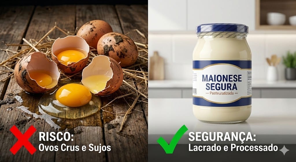 - Maionese Caseira: Feita com ovo cru. Se o ovo tiver uma microfissura na casca ou vier contaminado do galinheiro, não tem pasteurização para matar a bactéria. É roleta russa.