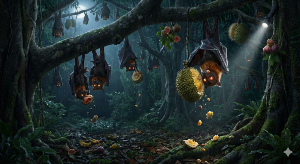 O vírus tem origem animal. Especificamente, morcegos frugívoros (que comem frutas) hospedam o vírus na natureza. Assim, a transmissão para humanos ocorre quando alguém consome frutas contaminadas pela saliva ou urina desses animais, ou através do contato direto com porcos doentes.