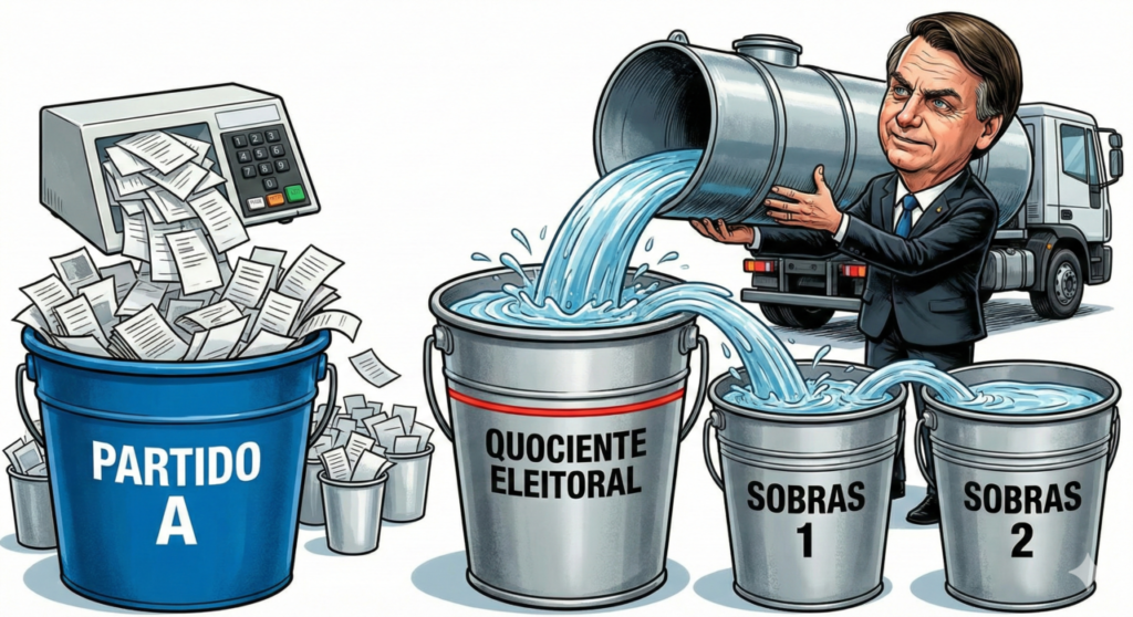 É aqui que entra o famoso “Efeito Tiririca”. Lembra quando o humorista teve mais de 1 milhão de votos para deputado federal? Na prática, ele não apenas encheu o balde do partido dele, como fez o balde transbordar várias vezes.